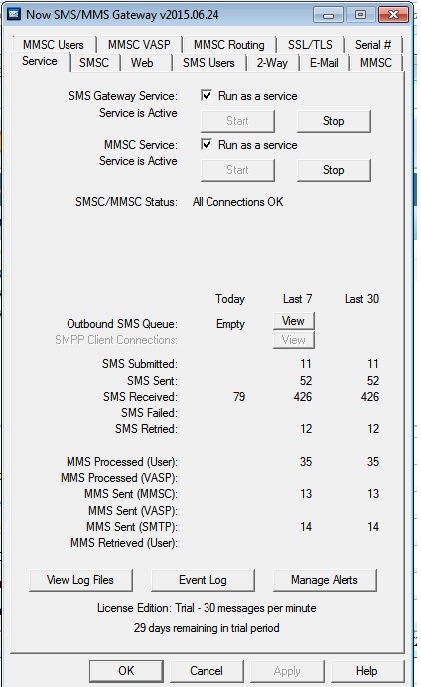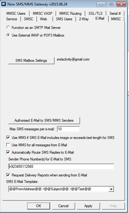 Hi It works perfectly. I have also enabled POP3 and SMS are received in MS Outlook. Here is screen shot of SMS count http://4.bp.blogspot.com/-QLFfhP2cit0/VfhYFID3-gI/AAAAAAAAAxY/syKOGbUNAYo/s1600/ Received%2BSMS.jpg | |||